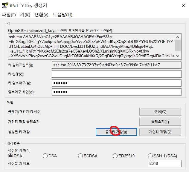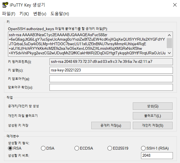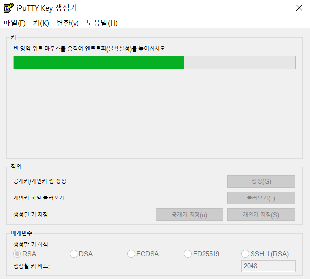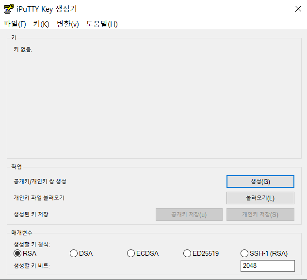 이제 Putty Key 생성기로 넘어와서 공개키/개인키 쌍을 생성해준다.