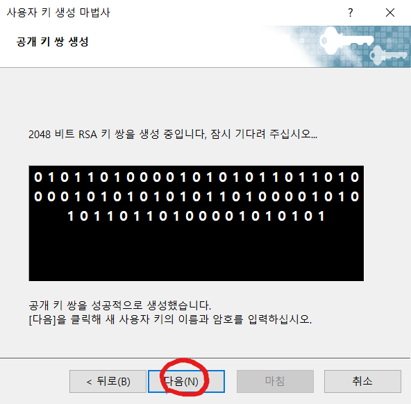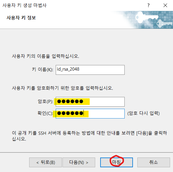 키의 암호를 설정하고 마침을 눌러줍니다.
