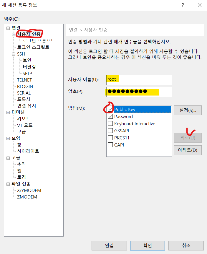 (위로 올리는 이유는 로그인 할 때 패스워드보다 공개키에 우선순위를 주기 위함입니다.)